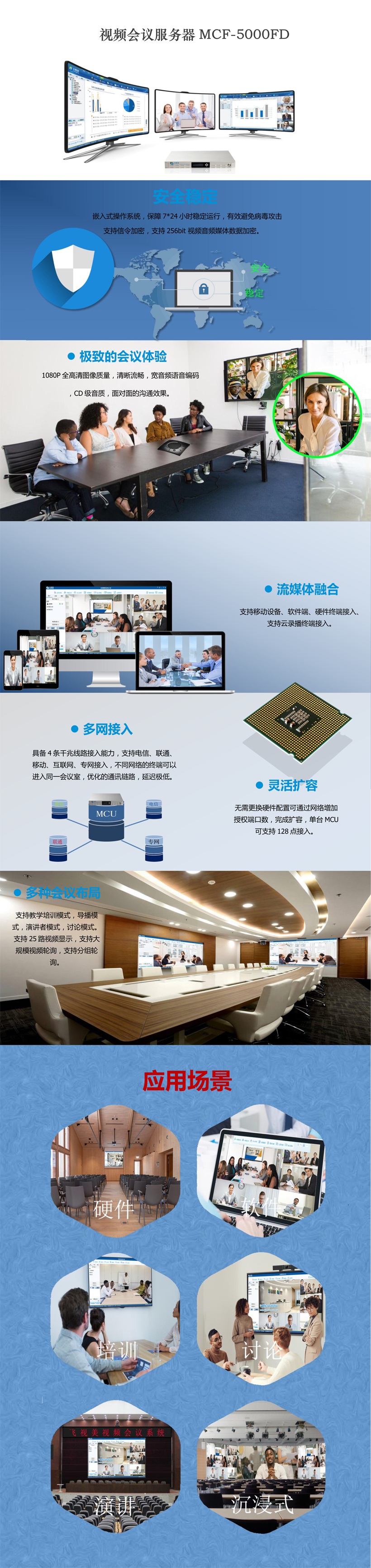 飛視美高清視頻會議MCU中文名稱為多點控制單元。多點控制單元通常部署在總部。作為視頻會議的大腦,提供基于IP的視頻會議網(wǎng)絡(luò)服務(wù)支撐,負(fù)責(zé)所有視頻會議終端的接入以及會議音視頻交互。為不同規(guī)模、不同領(lǐng)域的企業(yè)用戶提供專業(yè)強大的語音、視頻、數(shù)據(jù)融合的多媒體通訊,為用戶搭建全球的可視化通訊平臺。